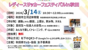 JFAレディースサッカーフェスティバルを開催いたします。 サッカー経験の有無やレベルに関係なく、仲間と一緒にサッカーする楽しさに触れ、スポーツの素晴らしさを知っていただけるイベントとなっております。 3/14(土) 秋田 […] -